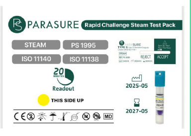 | PS 1995 | Rapid Challenge Steam Test Pack | Contains a 20 minute readout steam BI and a Class 5 Integrator chemical indicator. | Conforms to EN ISO 11138 and ISO 11140. | 20 minutes | Presents a resistant challenge equivalent to the AAMI 16-towel PCD. Integrator Type-5 gives a positive visual result when the line passes to the accept zone. |